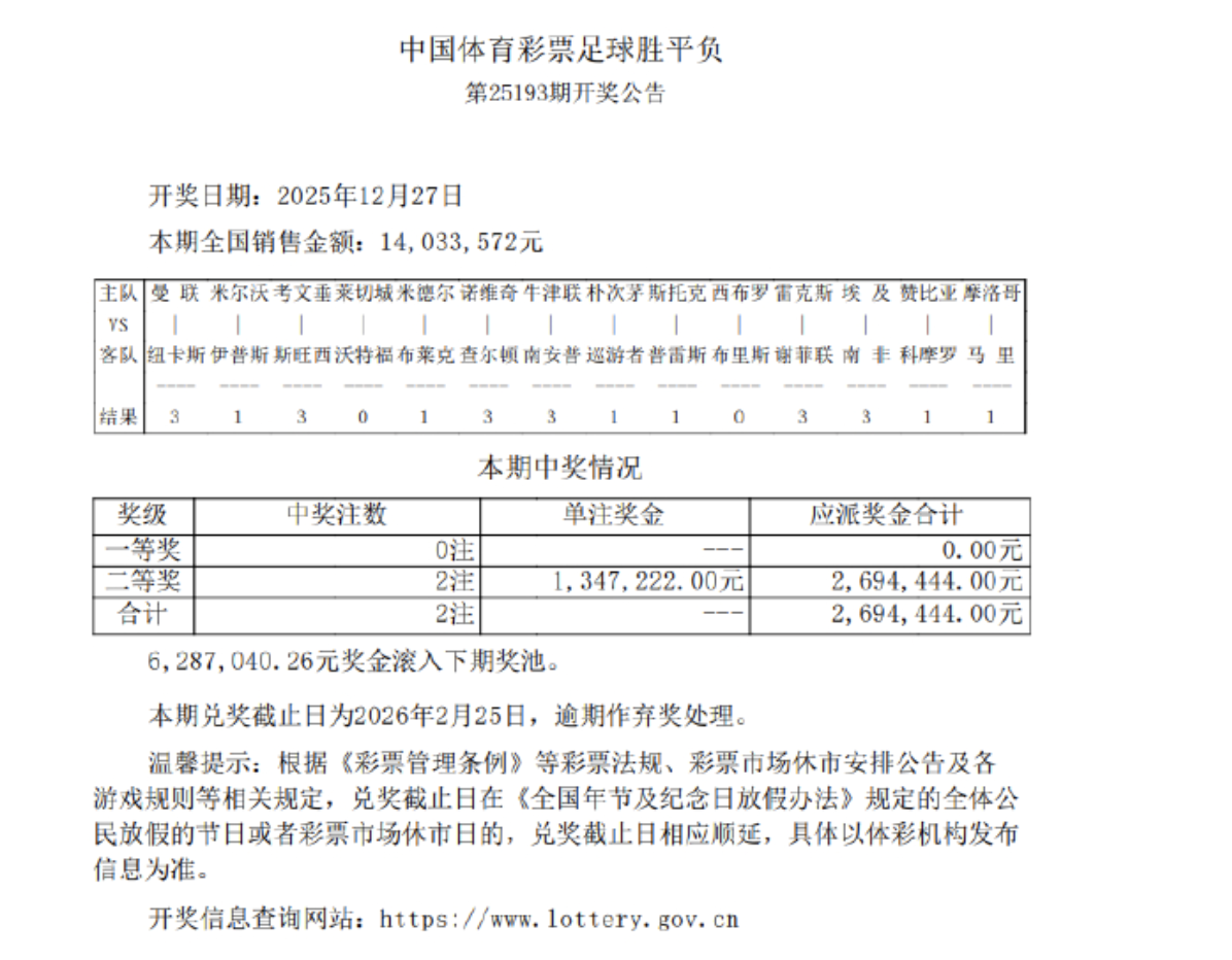 北京时间12月27日,胜负彩第25193期开奖结果揭晓。本期14场头奖空开,二等奖也仅开出2注,单注奖金1,347,222元,6,287,040元奖金滚入下期奖池;任九开出125注79,934元。值得注意的是,134.7万是2025年开出的第二高足彩二等奖金,仅低于第25083期开出的290.2万。此外,134.7万是今年第3次开出百万以上足彩二等,TOP10排名如下: