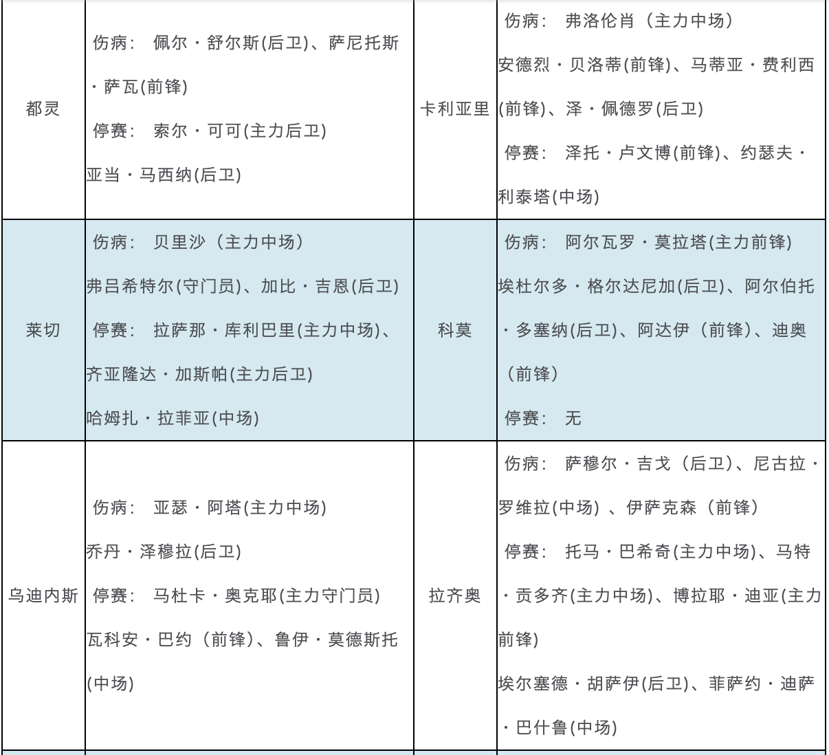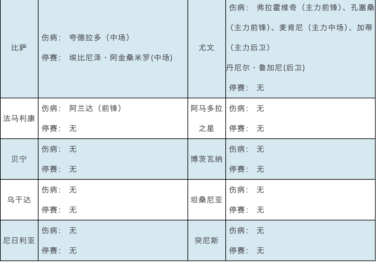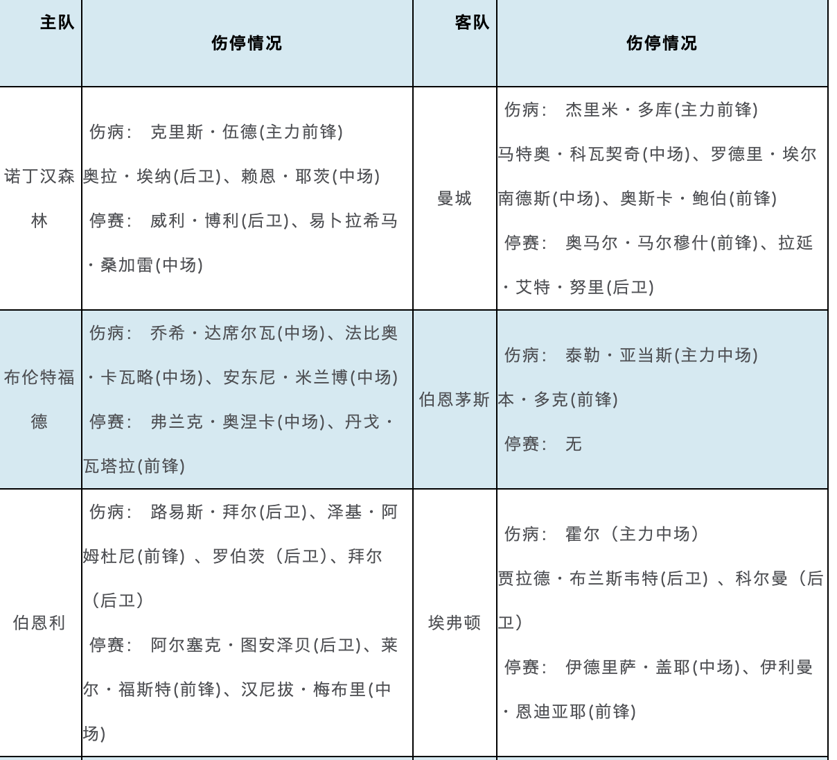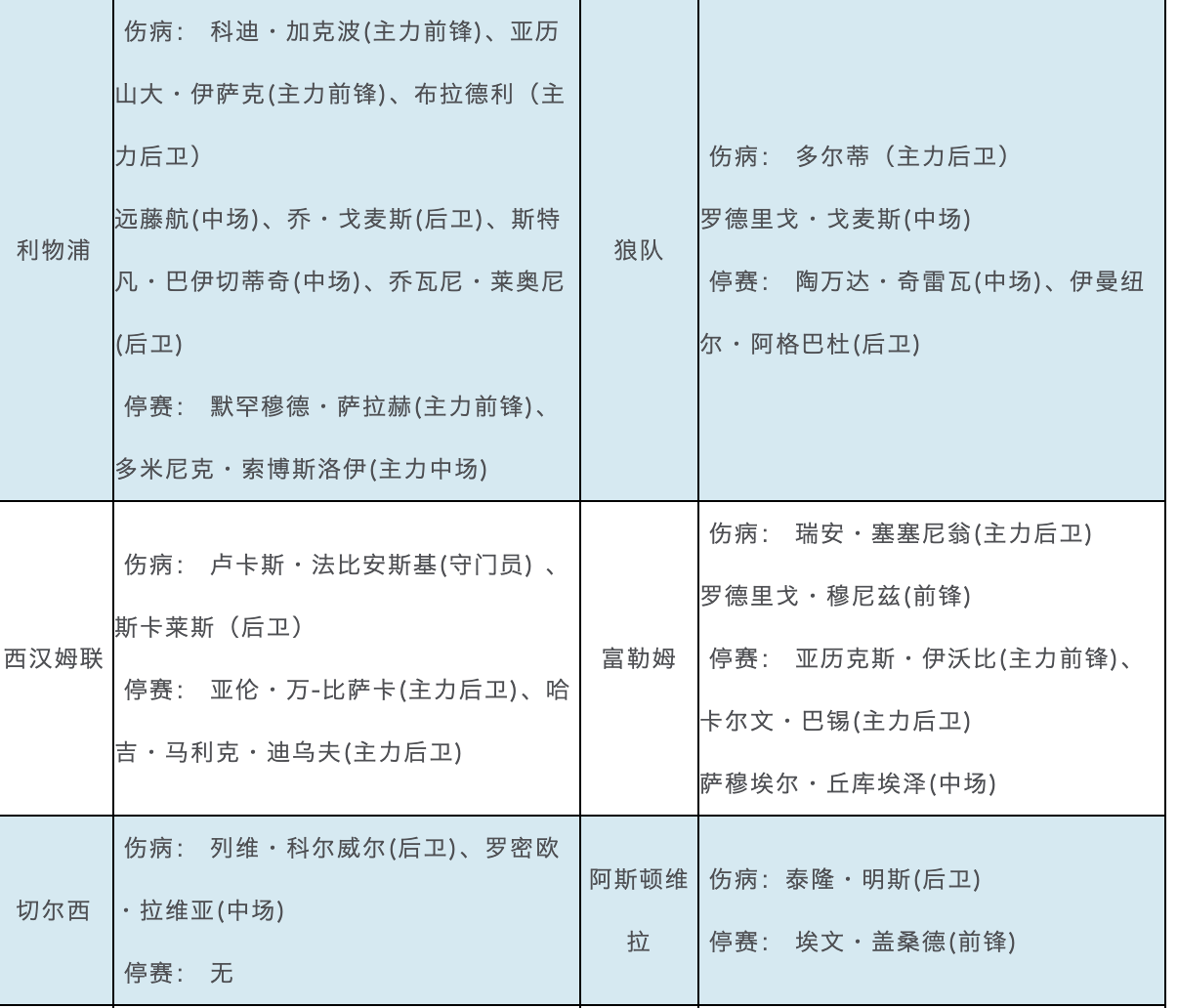 伤病点评:胜负彩第25194期由英超、意甲、葡超和非洲杯组成。英超赛场,曼城主力前锋多库无法出战,利物浦前锋伊萨克上轮替补出场破门后重伤离场,主力中场索伯斯洛伊累计黄牌停赛,队内多名重要球员本场比赛缺席。意甲赛场,拉齐奥多名主力参加非洲杯,尤文多名主力因伤缺阵。
