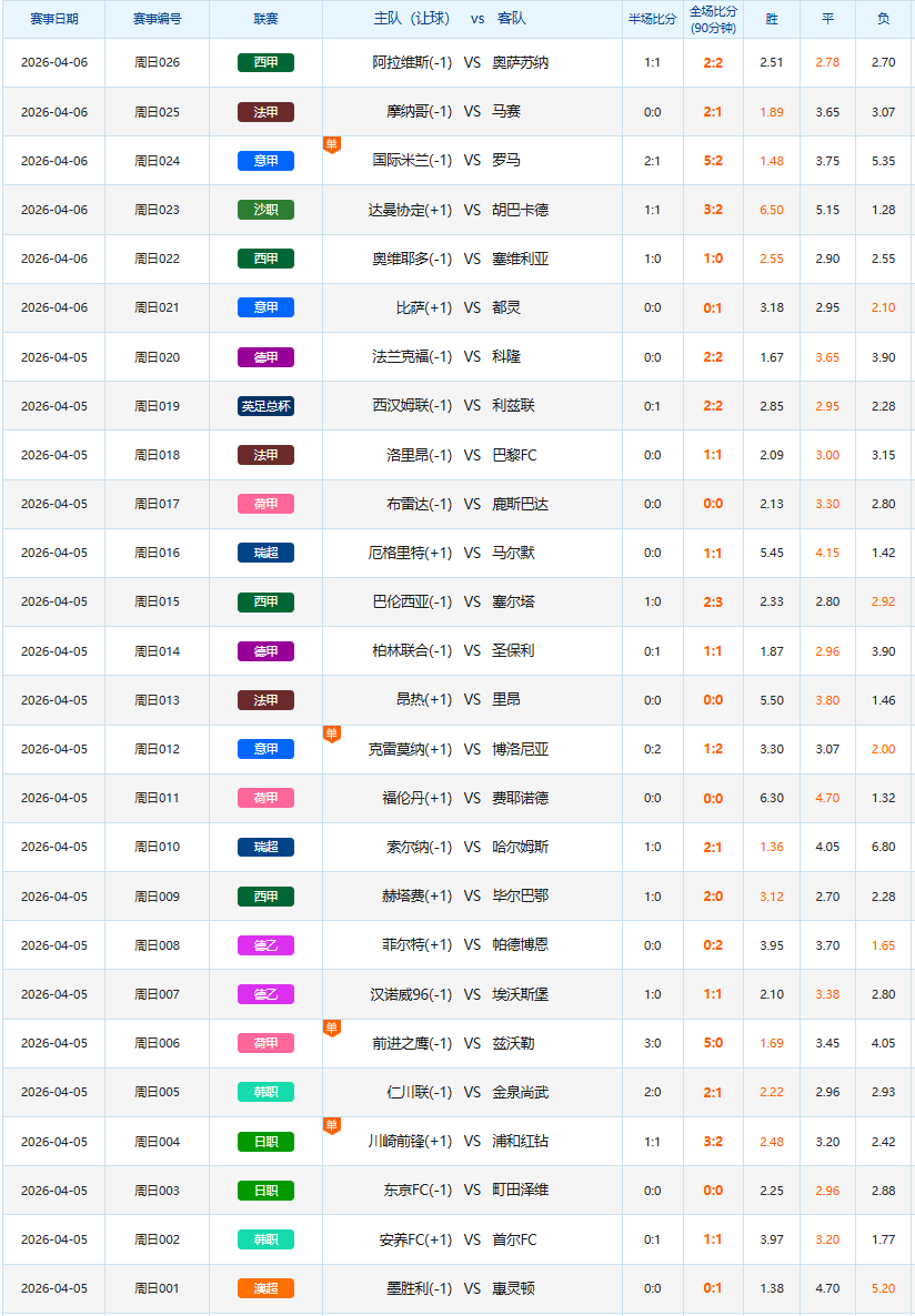 4月5日足球赛果开奖