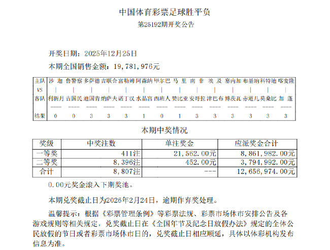 北京时间12月25日,胜负彩第25192期开奖结果揭晓。本期胜负彩一等奖开出411注,单注奖金21,562元;二等奖开出8,396注,单注奖金452元;任选九场开出44,142注,单注奖金195元。本期胜负彩销量为19,781,976元,任九投注总额为13,490,720元。