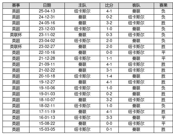 曼联 VS 纽卡斯尔两队近10年的交战次数为21场,曼联10胜4平7负,赢球概率为47.6%,平局概率为19.0%,输球概率为33.3%。