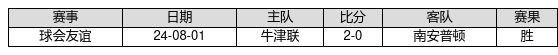 牛津联 VS 南安普顿两队近10年的交战次数为1场,牛津联1胜0平0负,赢球概率为100.0%,平局概率为0.0%,输球概率为0.0%。