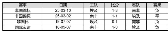 埃及 VS 南非两队近10年的交战次数为4场,埃及0胜1平3负,赢球概率为0.0%,平局概率为25.0%,输球概率为75.0%。