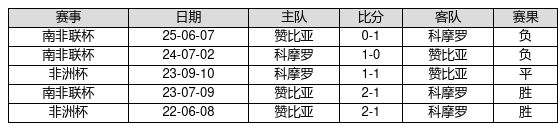 赞比亚 VS 科摩罗两队近10年的交战次数为5场,赞比亚2胜1平2负,赢球概率为40.0%,平局概率为20.0%,输球概率为40.0%。