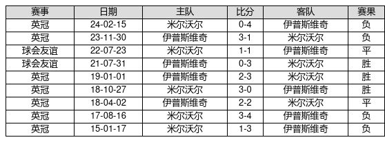 米尔沃尔 VS 伊普斯维奇两队近10年的交战次数为9场,米尔沃尔3胜2平4负,赢球概率为33.3%,平局概率为22.2%,输球概率为44.4%。