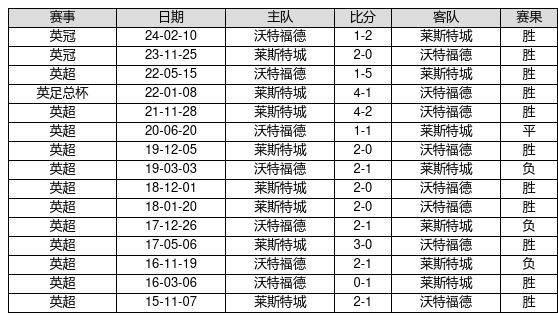 莱斯特城 VS 沃特福德两队近10年的交战次数为15场,莱斯特城11胜1平3负,赢球概率为73.3%,平局概率为6.7%,输球概率为20.0%。