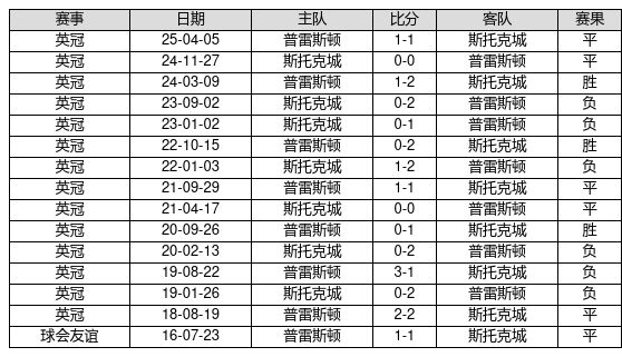 斯托克城 VS 普雷斯顿两队近10年的交战次数为15场,斯托克城3胜6平6负,赢球概率为20.0%,平局概率为40.0%,输球概率为40.0%。