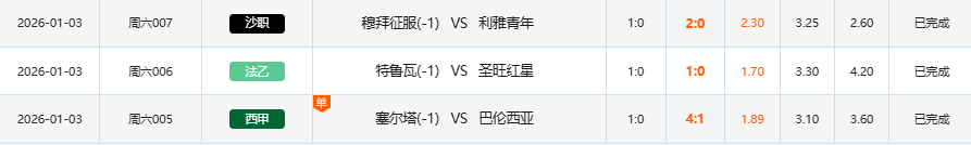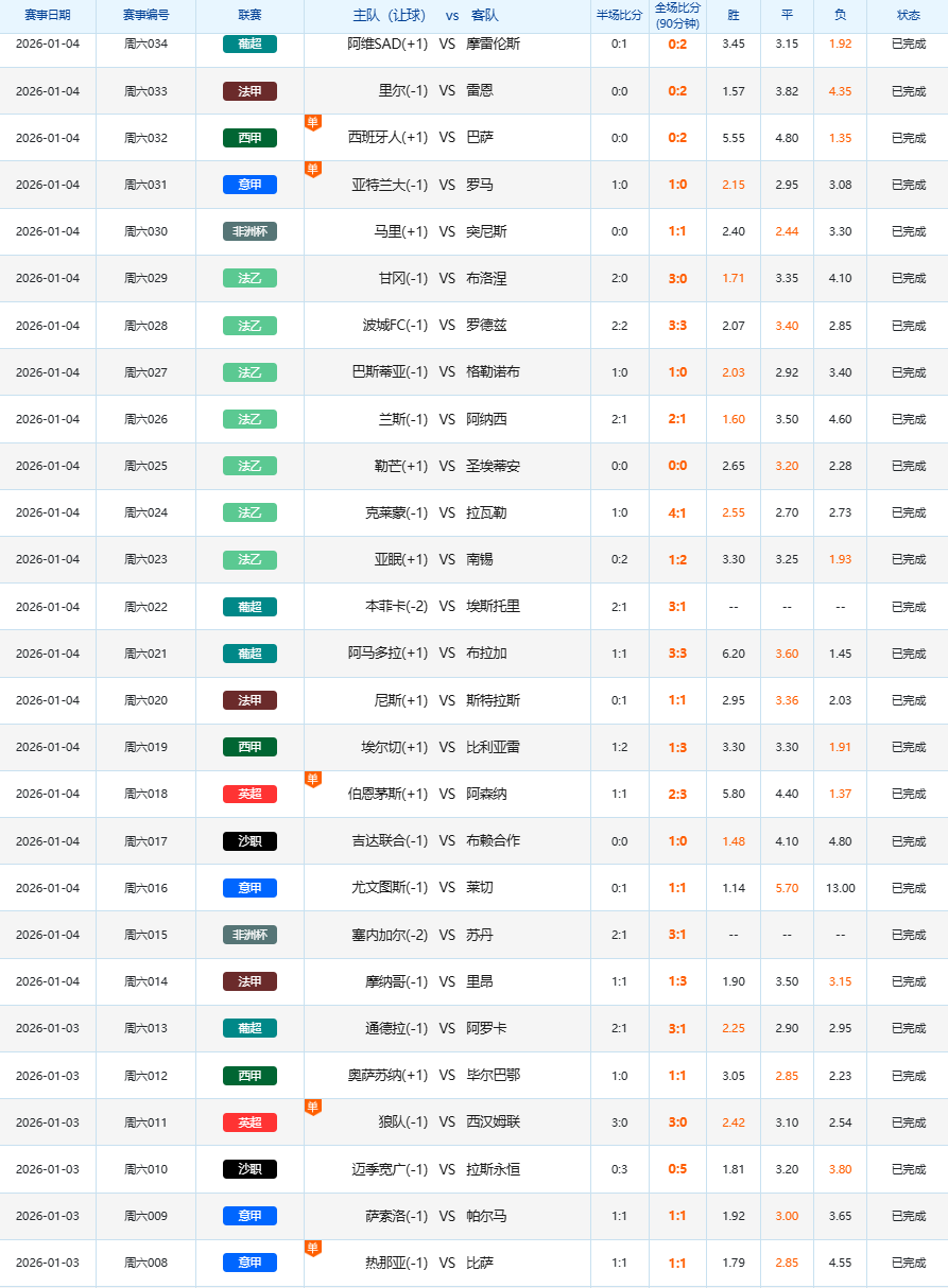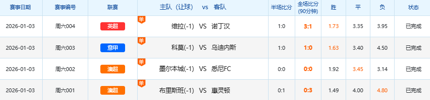 1月3日足球赛果开奖