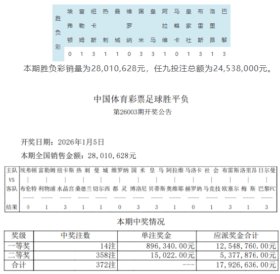 北京时间1月5日,足彩第26003期开奖结果揭晓。本期足彩头奖开出14注,单注奖金896,340元;二等奖开出358注15,022元;任九开8728注1799元。本期胜负彩销量为28,010,628元,任九投注总额为24,538,000元。