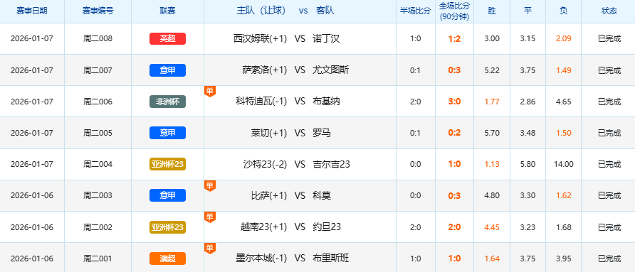 1月6日足球赛果开奖