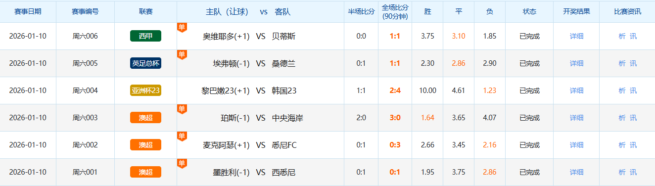 1月10日竞彩足球开奖结果