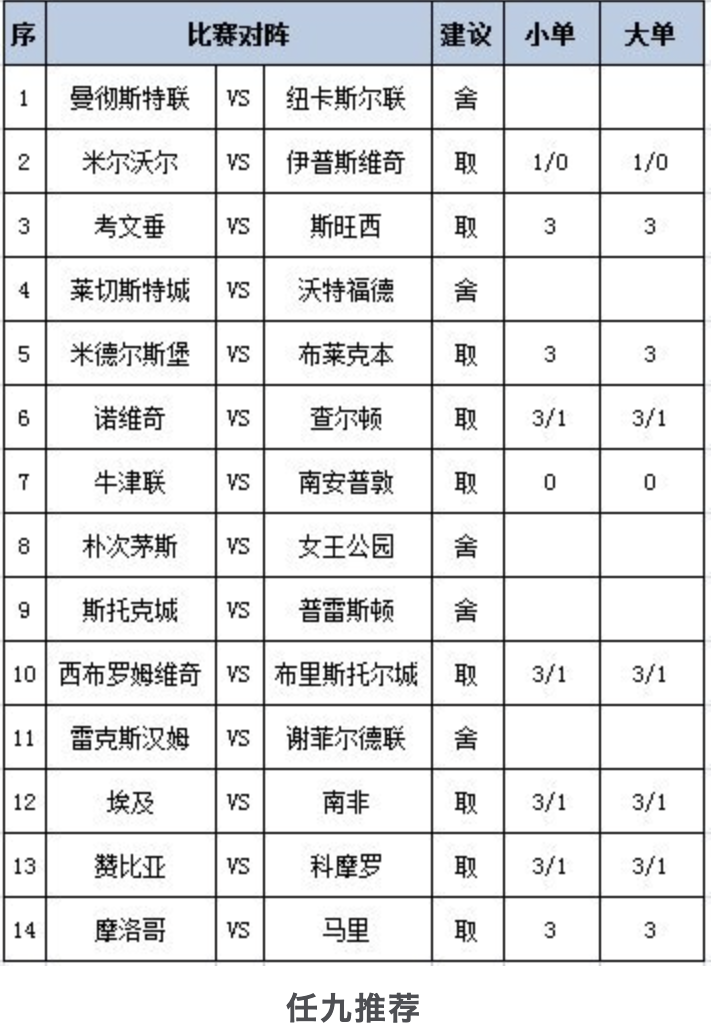 本期任九在1场英超+10场英冠+3场非洲杯的基础上舍弃了几场让步较浅的比赛:曼联上场在联赛中客场1-2不敌维拉,结束了自己连续4场不败的走势,状态回落,此役主场面对上场在联赛中主场2-2战平切尔西,最近4场各项赛事只赢下1场,发挥不足的纽卡,机构给出在平手的让步幅度,对于两队都没有倾斜,此役舍弃。